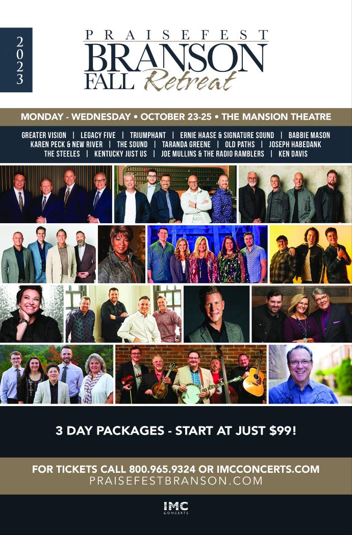 The Praisefest Branson Fall Retreat is 3 day, 4-session event with evening sessions beginning at 7 PM on Monday, October 23rd, and Tuesday, October 24th in the evenings. Morning sessions begin at 10 AM on Tuesday and Wednesday and will conclude by 1:00 PM. Hosted by IMC Concerts, this exciting event will take place at the Mansion Theatre. Award-winning Christian singer, Babbie Mason will be a featured artist during the 10:00 AM session on Wednesday, October 25th, 2023. We hope to see you there!