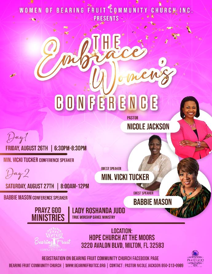 For more information on how to attend this event please contact Bearing Fruit Community Church at 850-313-0989. Click here to register: Embrace Woman's Conference